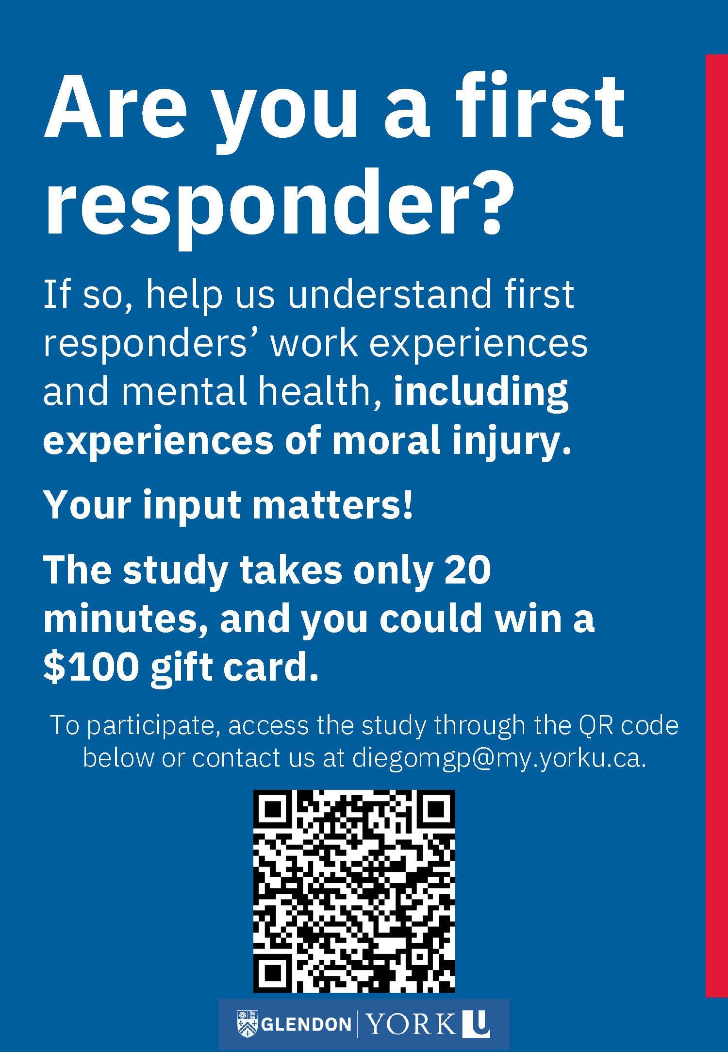 My name is Dr. Marianne O’Byrne, and I’m a Registered Psychologist who works primarily with first responders at Thrive Psychology and Wellness Centre. I am supporting Diego Pereira, a psychology major at Glendon College, York University, who is working on his honors thesis under the supervision of Professor Andrée-Ann Cyr and myself. We are conducting a study on the experiences and well-being of first responders, with a focus on moral injury.