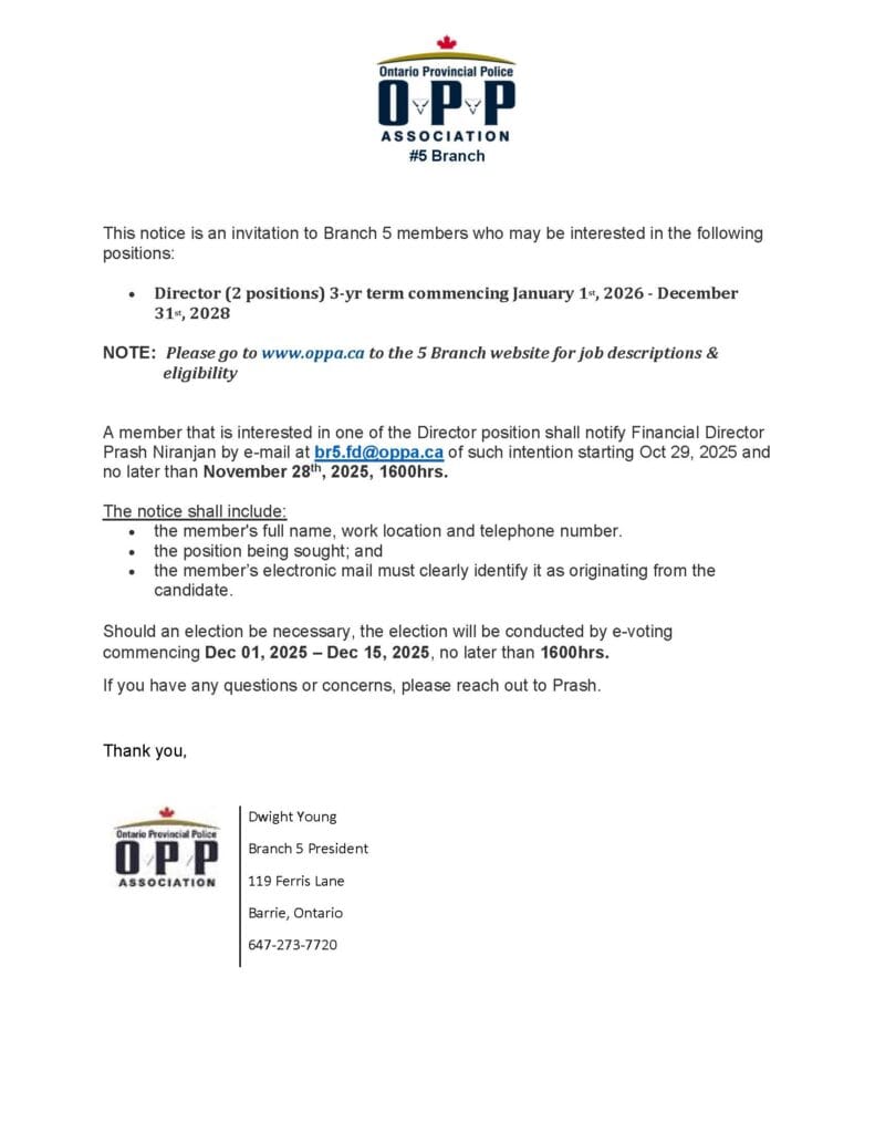 Expressions of Interest – OPPA Branch 5-Two Director Positions + Detachment Reps – Aurora, Caledon, Security Services and Whitby